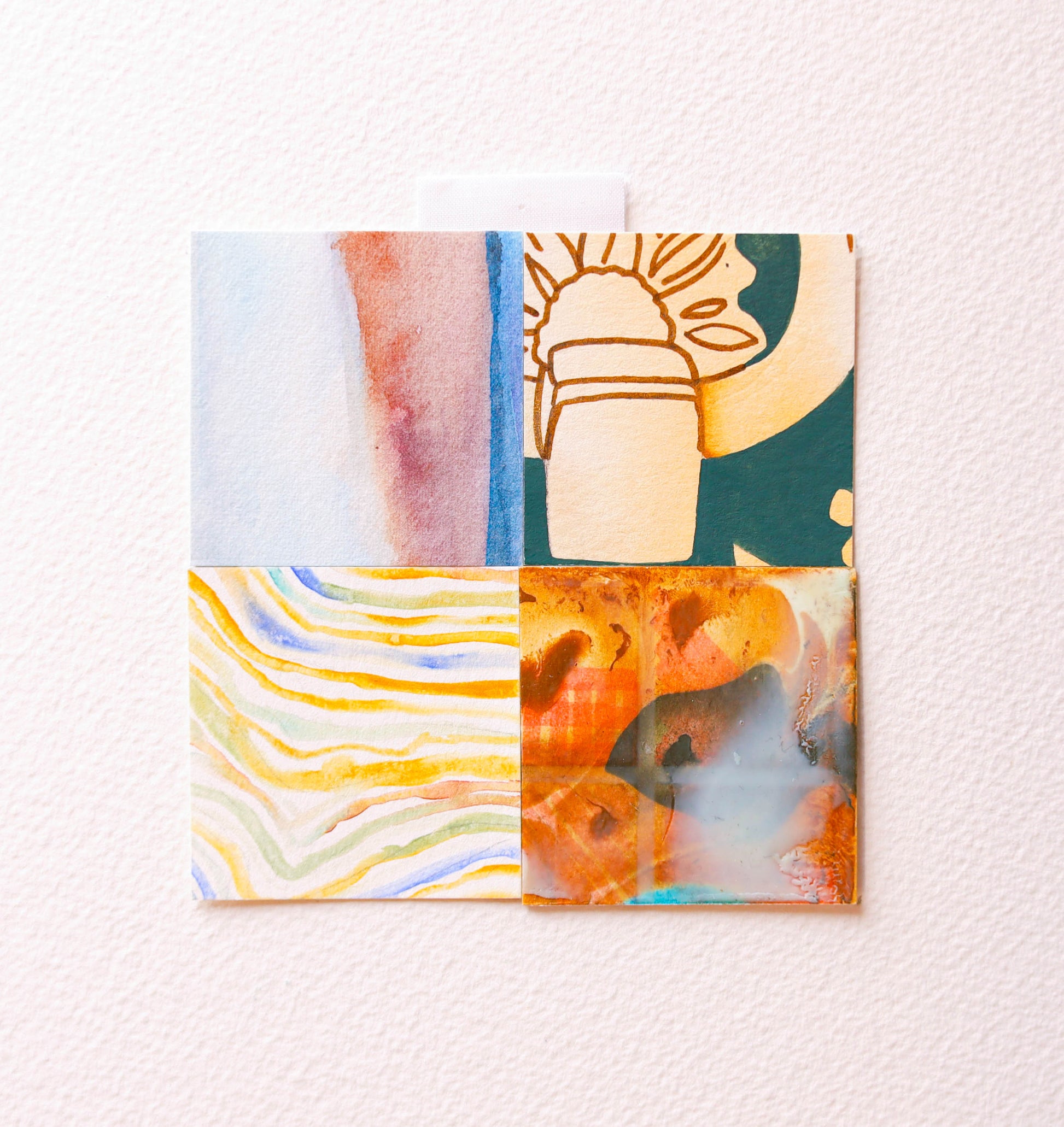These special mini paper quilts are composed of four 2" x 2" squares of original watercolor artwork sent to us by our amazing, generous community. We received work of all different sizes from over 60 people around the world and were completely blown away! From these pieces, we cut out thousands of individual squares in order to piece them back together to create new, original artworks.