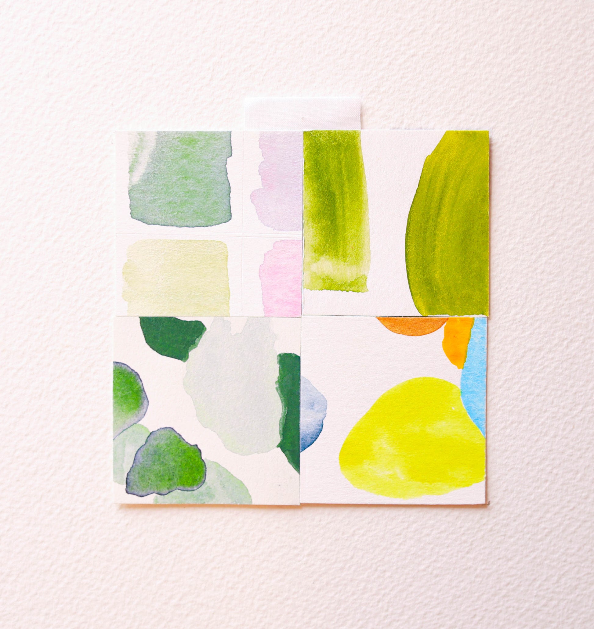 These special mini paper quilts are composed of four 2" x 2" squares of original watercolor artwork sent to us by our amazing, generous community. We received work of all different sizes from over 60 people around the world and were completely blown away! From these pieces, we cut out thousands of individual squares in order to piece them back together to create new, original artworks.