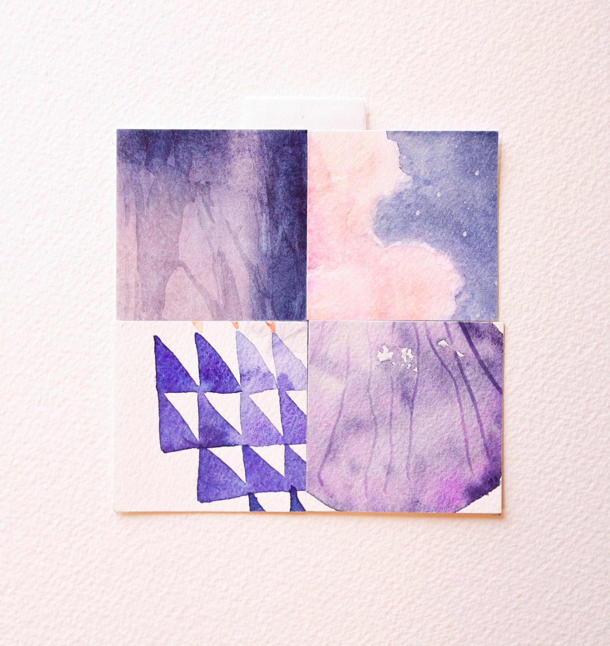 These special mini paper quilts are composed of four 2" x 2" squares of original watercolor artwork sent to us by our amazing, generous community. We received work of all different sizes from over 60 people around the world and were completely blown away! From these pieces, we cut out thousands of individual squares in order to piece them back together to create new, original artworks.