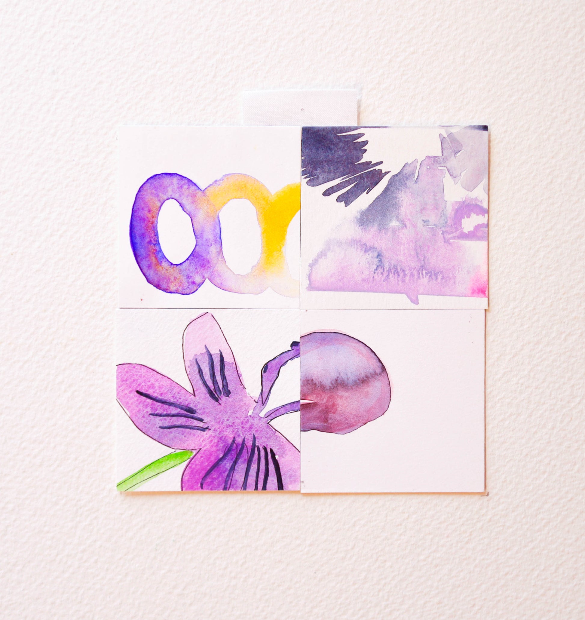 These special mini paper quilts are composed of four 2" x 2" squares of original watercolor artwork sent to us by our amazing, generous community. We received work of all different sizes from over 60 people around the world and were completely blown away! From these pieces, we cut out thousands of individual squares in order to piece them back together to create new, original artworks.