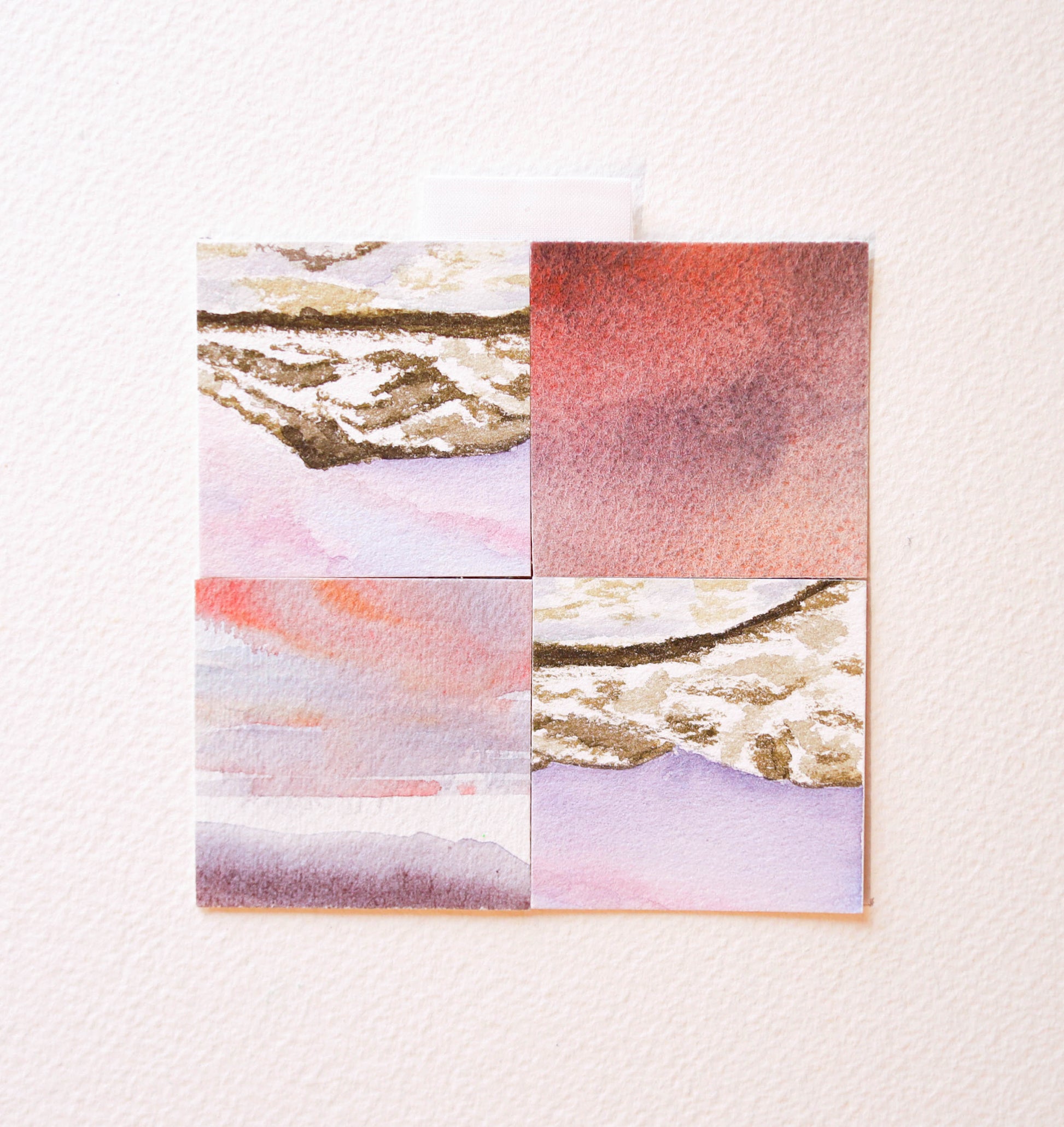 These special mini paper quilts are composed of four 2" x 2" squares of original watercolor artwork sent to us by our amazing, generous community. We received work of all different sizes from over 60 people around the world and were completely blown away! From these pieces, we cut out thousands of individual squares in order to piece them back together to create new, original artworks.