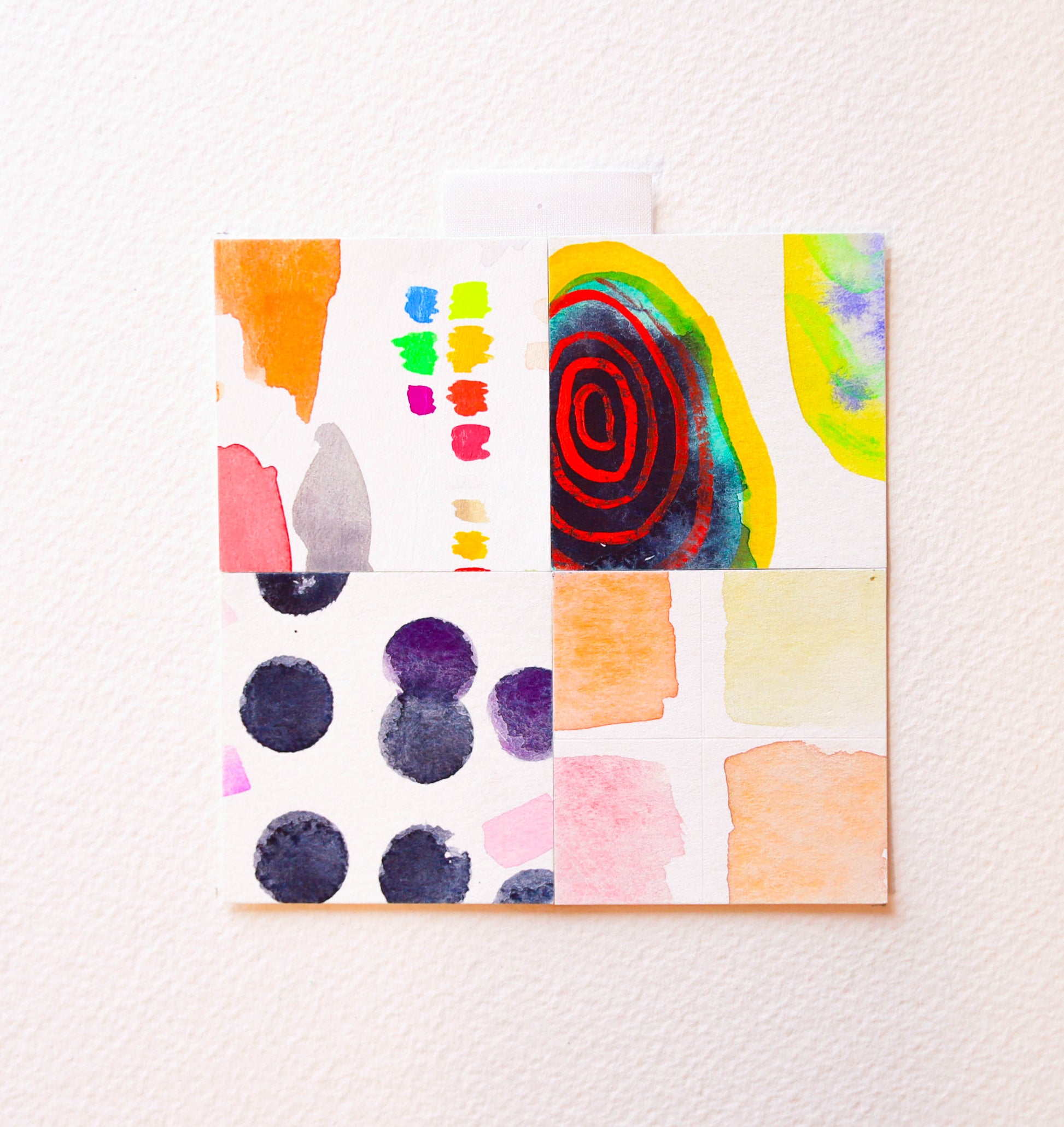 These special mini paper quilts are composed of four 2" x 2" squares of original watercolor artwork sent to us by our amazing, generous community. We received work of all different sizes from over 60 people around the world and were completely blown away! From these pieces, we cut out thousands of individual squares in order to piece them back together to create new, original artworks.